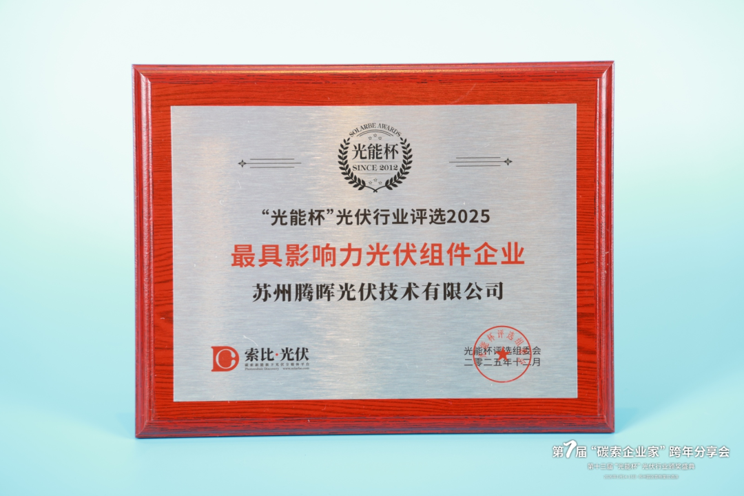 2025年1月15日,由索比光伏主办的第十三届“光能杯”光伏行业评选颁奖典礼在苏州隆重举行。苏州腾晖光伏技术有限公司凭借持续领先的技术创新能力、稳健的市场表现以及不断提升的品牌影响力,荣获 “2025年度最具影响力光伏组件企业” 大奖。