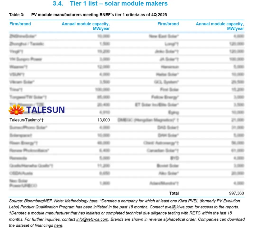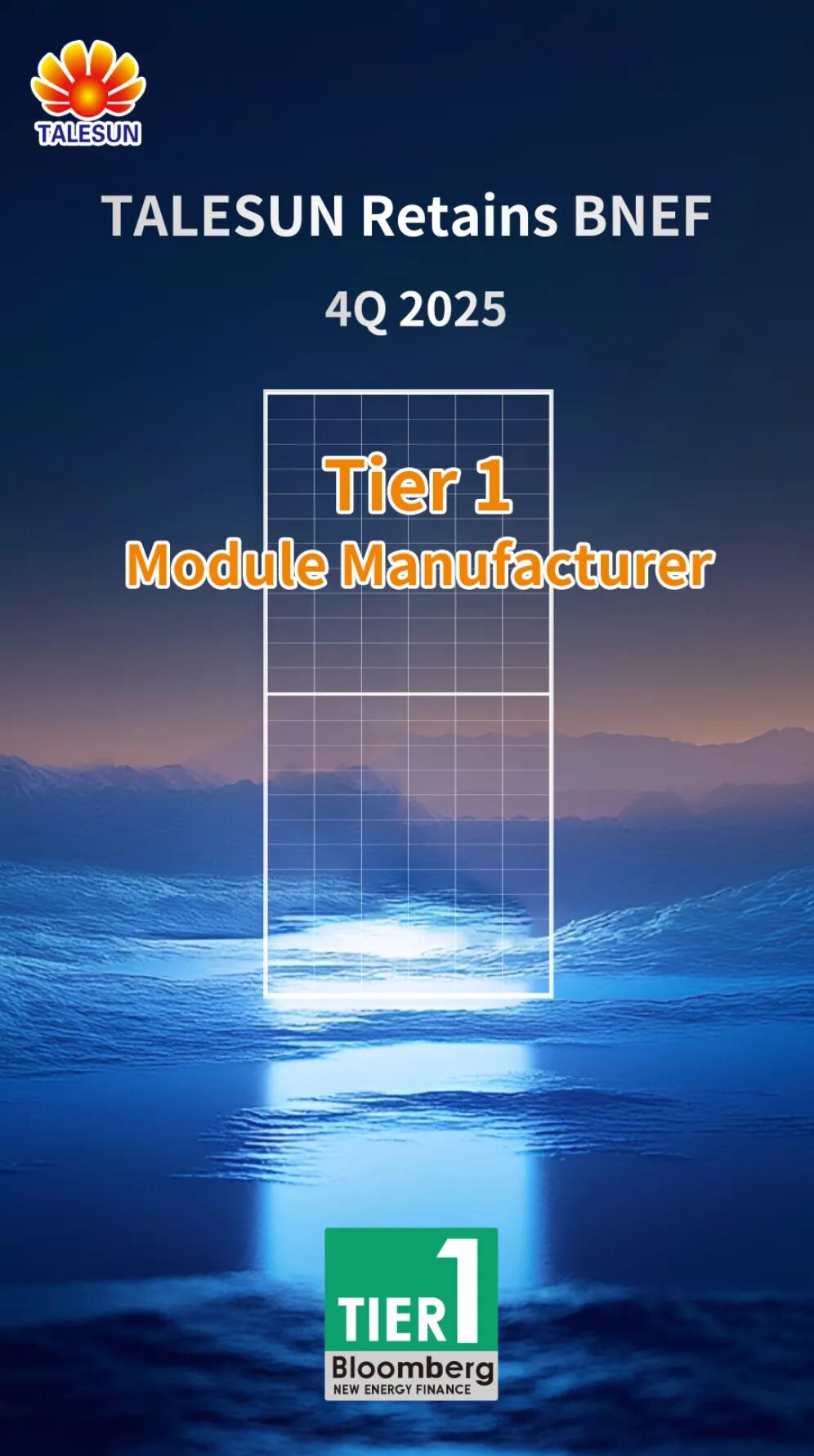 Recently, BloombergNEF (BNEF), a globally renowned energy research institution, released its latest quarterly “Tier 1” list of global photovoltaic module manufacturers. Thanks to its exceptional product reliability, strong financial capabilities, and outstanding global market performance, Talesun Solar has once again been included in the Tier 1 list, marking its continuous inclusion for four consecutive quarters in 2025.