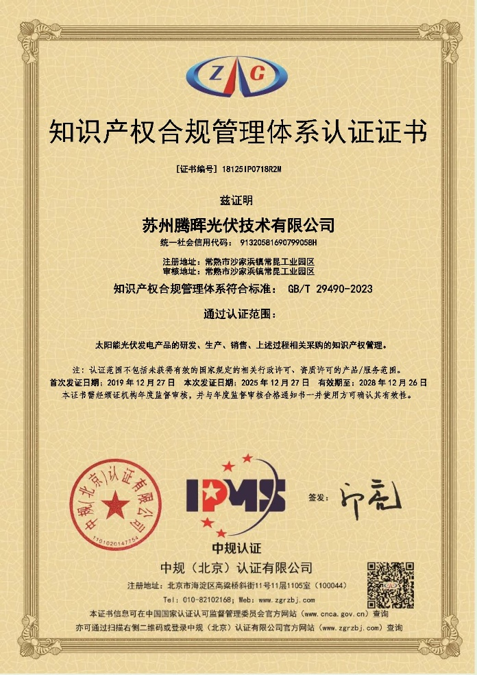 Suzhou Talesun Solar has always regarded intellectual property as a strategic resource for sustainable development and a core element of innovation-driven growth. The successful recertification under the updated standards not only signifies that the company’s intellectual property management system meets the latest national requirements but also reflects the continuous consolidation and improvement of the company’s refined and standardized management capabilities in the field of intellectual property.